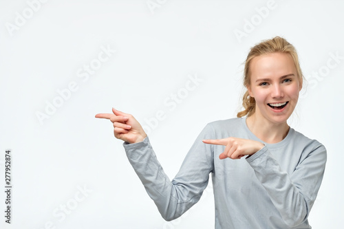 Happy young european woman standing islooking camera showing on copyspace pointing with finger. Studio shot. Positive facial emotion.