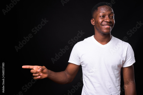 Happy young handsome African man against black background