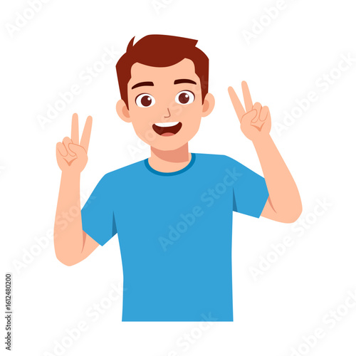 Happy young man in blue t-shirt showing peace sign with both hands on a white background
