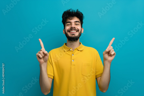 Happy Young Man in Yellow Shirt Pointing Up with Both Hands Against Blue Background