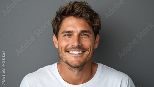 Happy young man smiling against a gray background. Positive and cheerful mood.