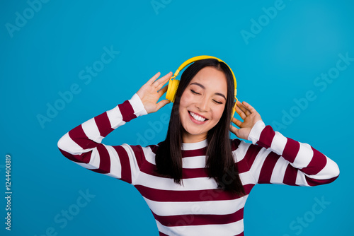 Happy young woman enjoying music on headphones with a bright blue background