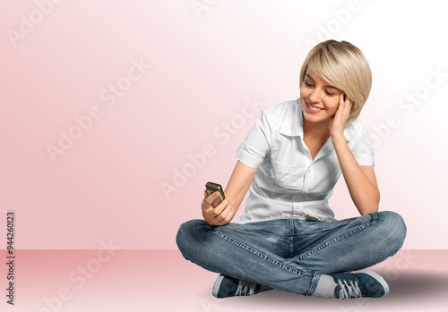 Happy young woman hold mobile cell phone