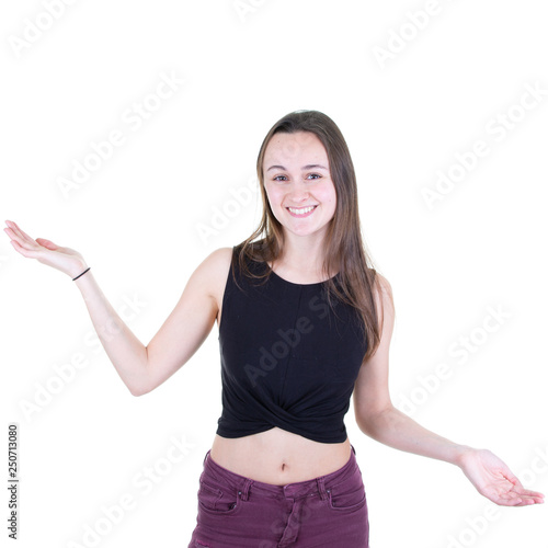 Happy young woman holding copyspace on both two palms