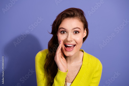 Happy young woman in a bright yellow sweater with a cheerful expression against a stylish purple background
