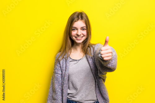 Happy young woman or teen girl in casual clothes showing thumbs up isolated on yellow background