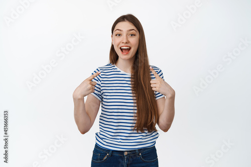 Happy young woman pointing at herself and laughing, smiling satisfied, standing over white background