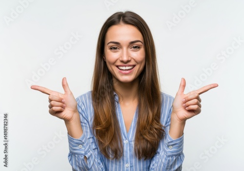 Happy Young Woman Pointing Both Sides Smiling at Camera White Background