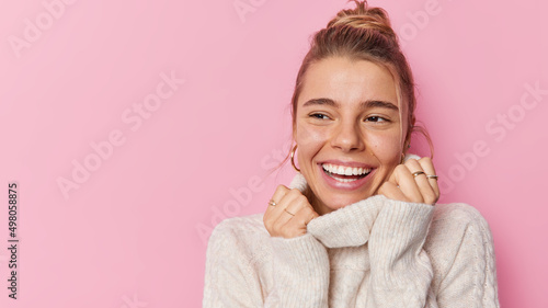 Happy young woman smiles broadly looks gladfully away keeps hands on collar of jumper feels joyful has blonde hair combed in bun stands against pink background copy space for your promotion.