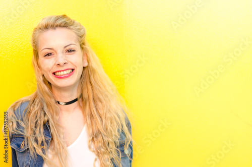 happy young woman smiling at yellow wall