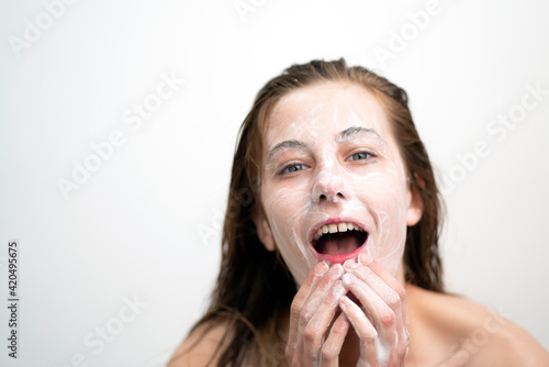 Happy Young Woman Washing her Face with Cream, Studio Shot on White Background