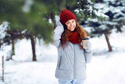 Happy young woman with a cup of hot coffee on snowy winter walk in nature. Concept of frost winter season. The girl is dressed in a blue jacket, knitted hat, scarf and mittens.
