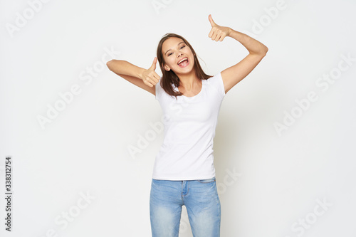 happy young woman with arms raised