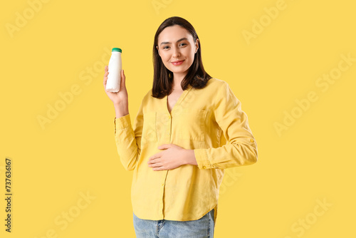 Happy young woman with bottle of tasty yoghurt on yellow background