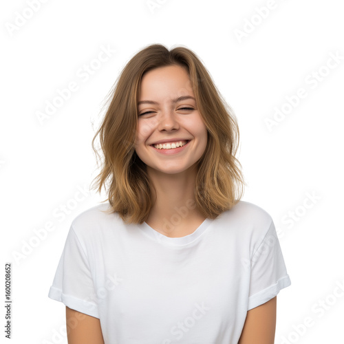 Happy young woman with radiant smile and joyful expression isolated on white background