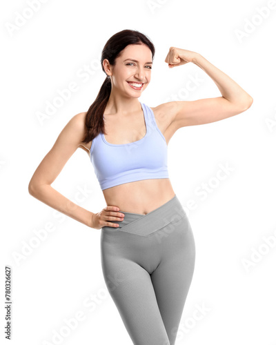 Happy young woman with slim body showing muscles on white background