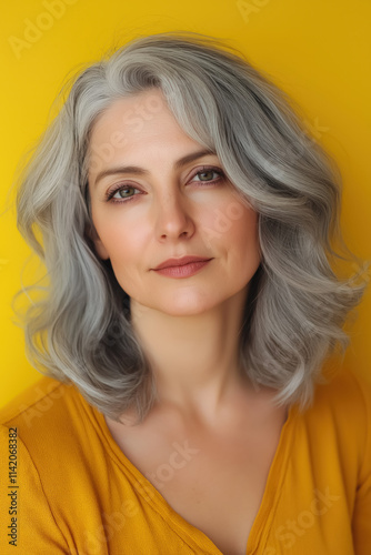 harming portrait of a forty year old woman with silver grey hair, her serene expression set against a yellow background