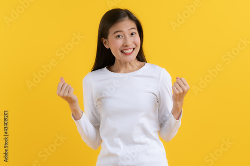 Head shot Beautiful young woman surprised facial expression after seeing shocking, amaze deal in mobile phone isolated on yellow background. Studio shot. banner size.