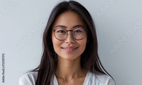 Head shot happy portrait young asian woman in glasses - millennial brunette girl with healthy white toothy smile