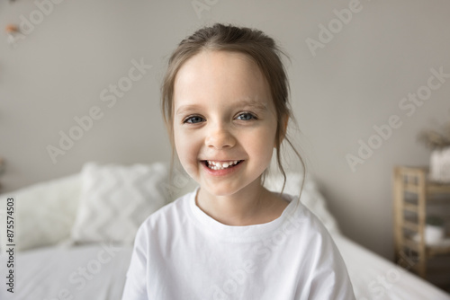 Head shot of small awakened refreshed laughing girl in white pyjama sit on cozy bed in bedroom in morning at home, smile, look at camera. Carefree well-being childhood, alpha generation child portrait