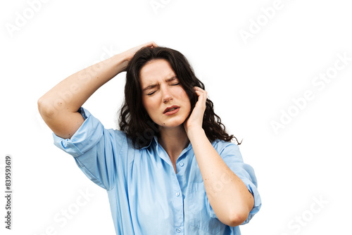 Headache. Migraine Is A Neurologic Disorder That Causes A Strong Headache. Attractive Woman With Migraine Touch Her Had. Stress.