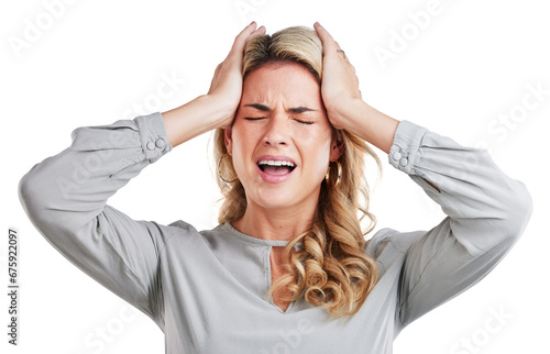 Headache, stress woman with anxiety for tax, audit or debt problem on isolated, transparent or png background. Burnout, migraine or model with tinnitus, vertigo or frustrated by brain fog or disaster