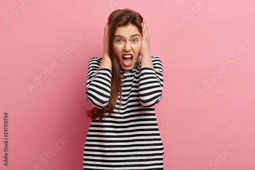 Headshot of frustrated young European lady keeps hands on ears, wears casual striped jumper, yells in displeasure, expresses negative emotions, isolated over pink background. Oh no, stop it please