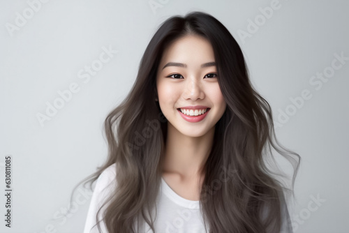 Headshot of girl with a long hair and little natural curly hairstyle wearing tshirt isolated on white grey background. Beauty girl with long and shiny wavy Hair. Generative AI.