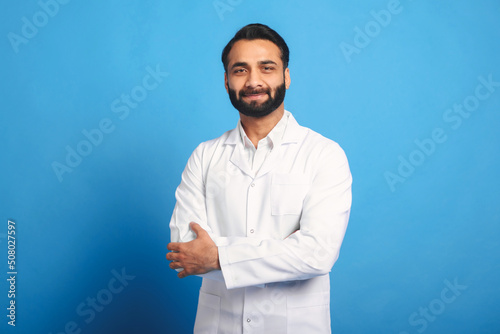 Headshot of intelligent professional Indian male doctor wearing medical white gown looking at the camera, therapist physician standing isolated on blue