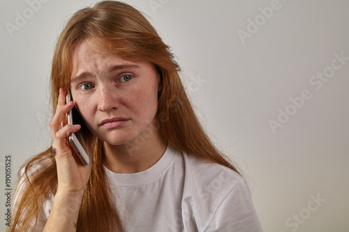 Headshot of young red-headed girl with freckles holding her phone next to her ear and talking with sad expression on her face