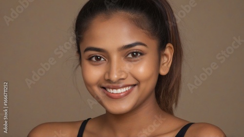 Headshot portrait of a beautiful, happy young South Asian woman with a radiant smile and a ponytail, on a brown background.