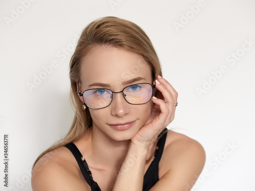 Headshot portrait of a cute natural looking blonde woman wearing simple black blouse and nerd glasses posing on a white background resting chin on hand