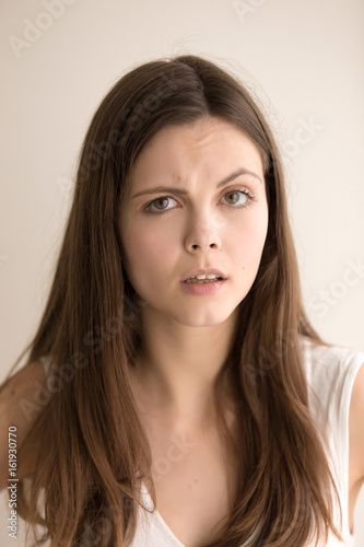 Headshot portrait of disappointed young woman. Adorable teenager girl with skeptic facial expression looking at camera with confusion. Cute lady feeling uncertain or suspicious. Close up. Front view