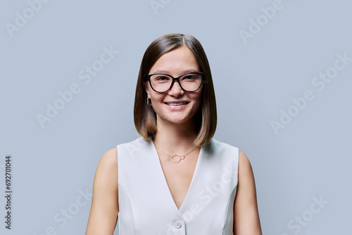 Headshot portrait of young beautiful woman in glasses, on grey studio background