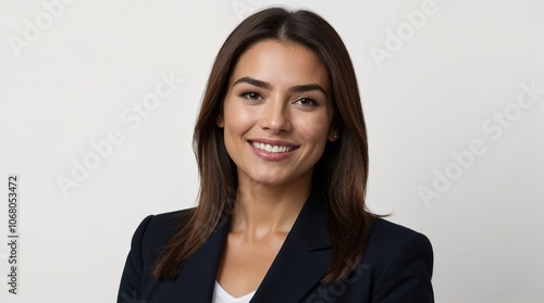 Headshot portrait of young happy businesswoman casual attire isolated on white background