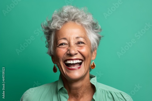 Headshot portrait photography of a happy mature woman winking against a spearmint green background. With generative AI technology
