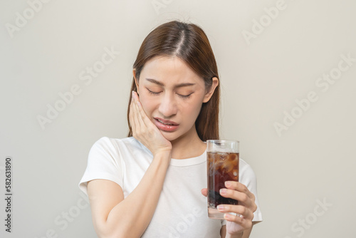 Health asian young woman touching her mouth, expression, suffering from toothache, decay or sensitivity cavity molar tooth or inflammation drink cold, sparkling water at home.Sensitive teeth people.
