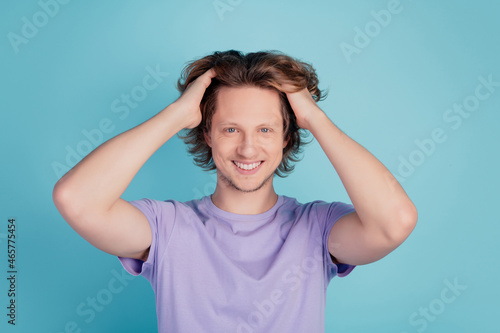 Healthy positive candid guy touch curly wavy hair beaming smile look camera