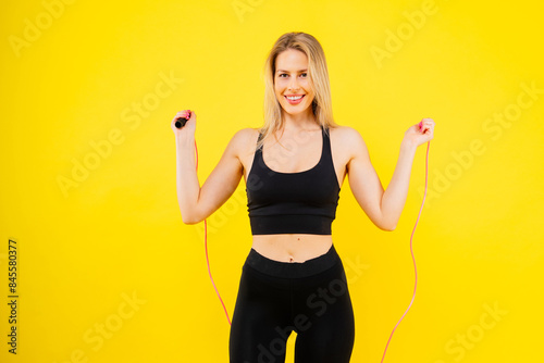 Healthy young woman skipping rope in studio. Muscular young female exercising with jumping rope