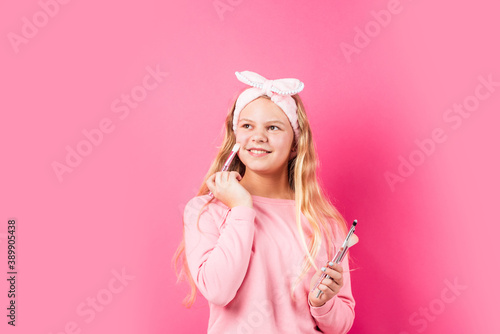 her look is great. Beauty salon. happy childhood. fashion and beauty. retro girl put natural makeup with brush. hair and skin care. small girl wear vintage headband. beautiful kid play cosmetics