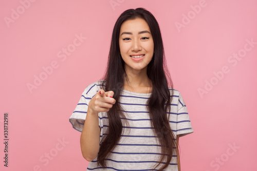 Hey you! Portrait of cheerful girl with long brunette hair in striped t-shirt pointing to camera and smiling, gesturing we need you, making choice. indoor studio shot isolated on pink background