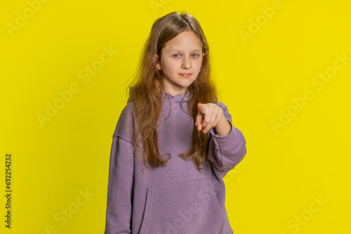 Hey you. Portrait of happy young child girl kid smiling excitedly and pointing forward to camera choosing lucky game winner indicating to awesome you, promotion. Teenager children on yellow background