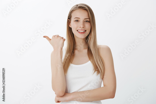 Hey you wanna see it. Portrait of friendly-looking confident pleasant woman in tank-top pointing left with thumb as showing cool thing, smiling broadly, casually talking to mate over gray background