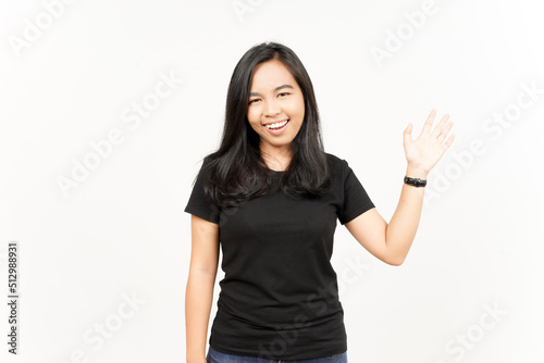 Hi Greeting or Waving at Camera of Beautiful Asian Woman Isolated On White Background