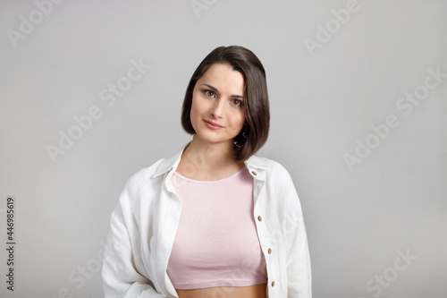 High key calm portrait of young brunette mixed race woman in pink tank and white shirt looking at camera
