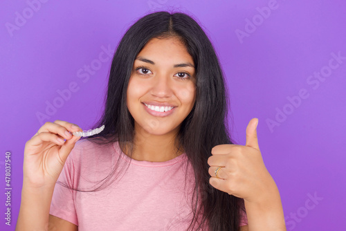 Hispanic brunette girl wearing pink t-shirt over purple background holding an invisible braces aligner and rising thumb up, recommending this new treatment. Dental healthcare concept.