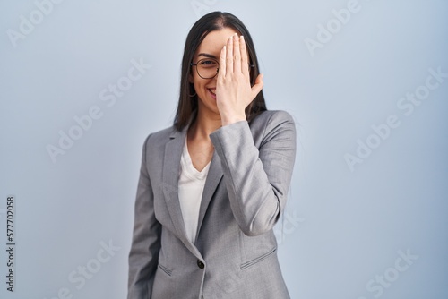 Hispanic business woman wearing glasses covering one eye with hand, confident smile on face and surprise emotion.
