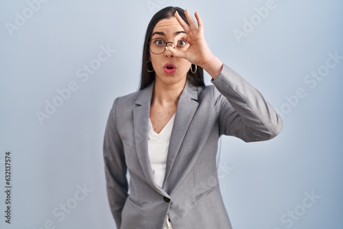 Hispanic business woman wearing glasses doing ok gesture shocked with surprised face, eye looking through fingers. unbelieving expression.