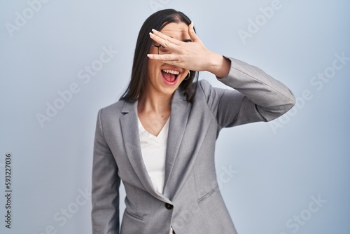 Hispanic business woman wearing glasses peeking in shock covering face and eyes with hand, looking through fingers with embarrassed expression.