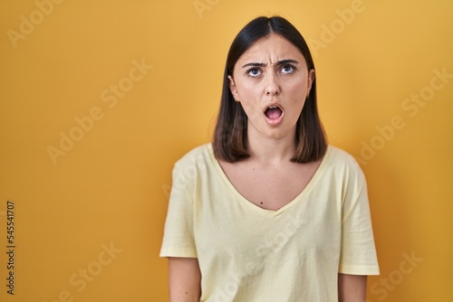 Hispanic girl wearing casual t shirt over yellow background angry and mad screaming frustrated and furious, shouting with anger. rage and aggressive concept.